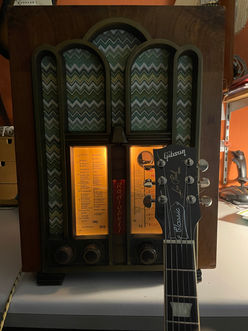 Ik had al lang het idee om een clone van een Fender 5E3 Deluxe te bouwen, maar wou er ook mijn dingen aan toevoegen. Gelukkig vond ik een mooie oude (niet werkende en redelijk gehavende) RadioBell type 385 uit 1938 die kon dienen als chassis en behuizing. Nadat de versterker gebouwd was moest ik nog een "magic eye" vinden om de looks af te maken. vermits deze buizen bijna niet meer te vinden zijn (lees onbetaalbaar) heb ik dan een LED versie ervan gemaakt. bij het testen bleek dat de LED's ook nog vervorming van het eind signaal bewerkstelden, dus nu schakelbare overdrive :-)! Joske werkte hem af met een mooi stofje.